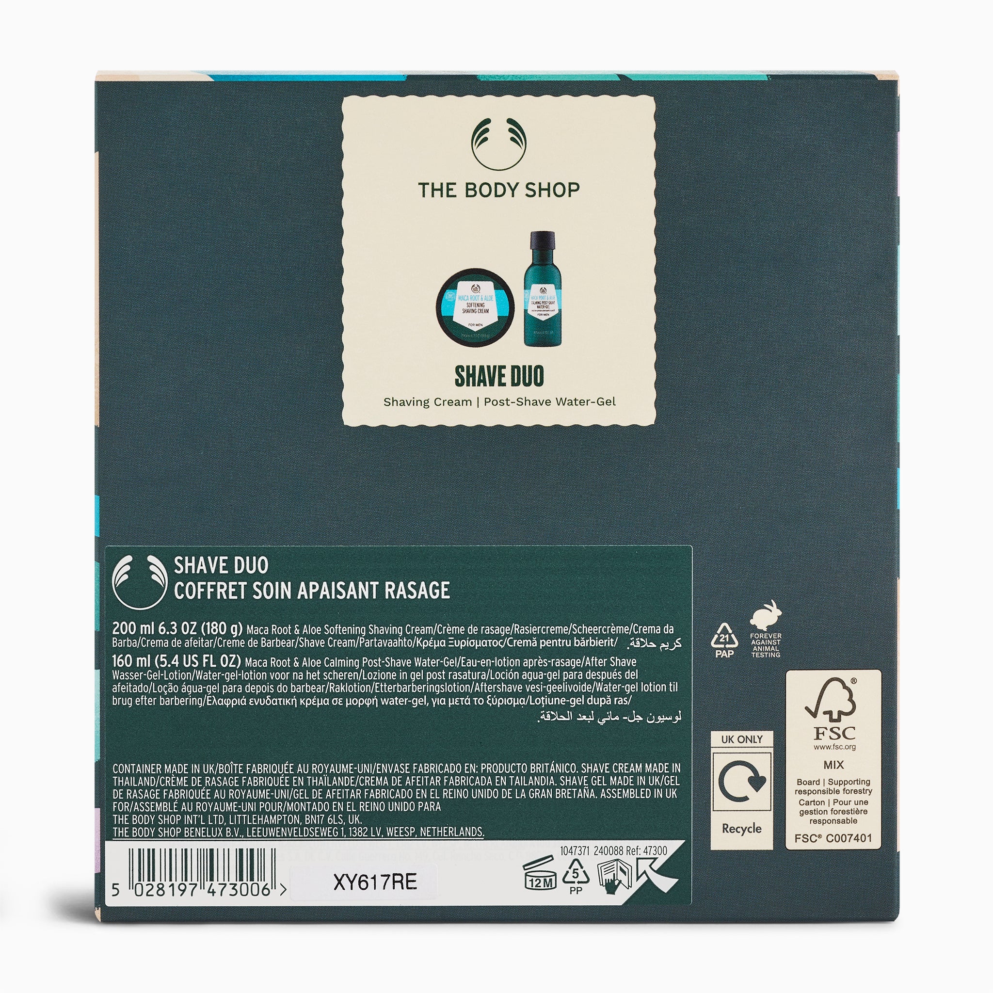 Deze set bevat een scheercrème met macawortel en aloë en een aftershave-gel, beide verrijkt met fairtrade aloë vera uit Mexico om de droge huid te kalmeren en te verzorgen. Samen zorgen ze voor een gladde, comfortabele scheerbeurt en laten ze de huid fris en verzorgd aanvoelen.