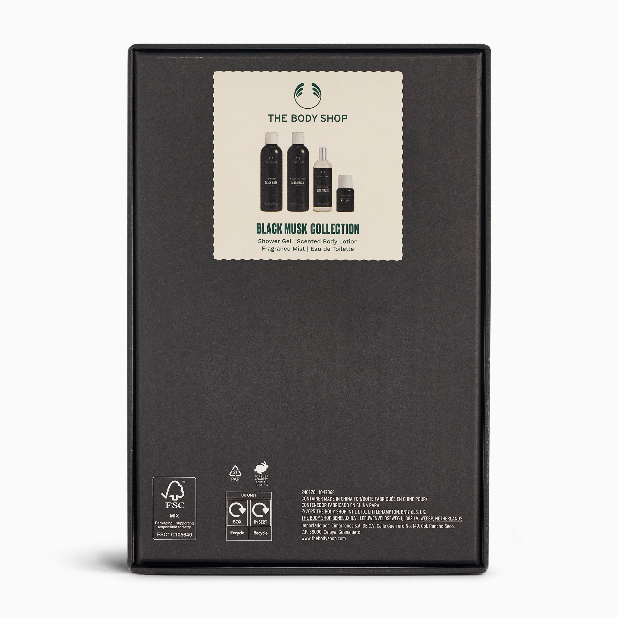 Das Set enthält ein Black Musk Duschgel, das die Haut reinigt und zart beduftet, eine Body Lotion, die Feuchtigkeit spendet und den Duft intensiviert, einen Body Mist für einen leichten Rundumduft und ein Eau de Toilette, das das unverwechselbare Black Musk Erlebnis abrundet. Tief, warm und verführerisch – ein raffiniertes Geschenk für alle, die gern ein Statement setzen.