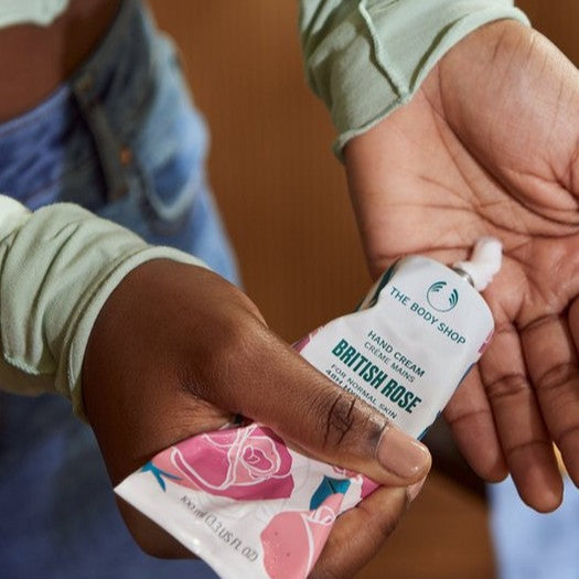 Unsere vegane Handcreme besteht jetzt zu 93 % aus natürlichen Inhaltsstoffen, darunter Extrakte aus handverlesenen Rosen aus Großbritannien und handgefertigter Sheabutter aus Ghana, die im fairen Handel erworben wurde. Sie pflegt Nägel und Nagelhaut und versorgt die Haut 48 Stunden lang mit Feuchtigkeit.