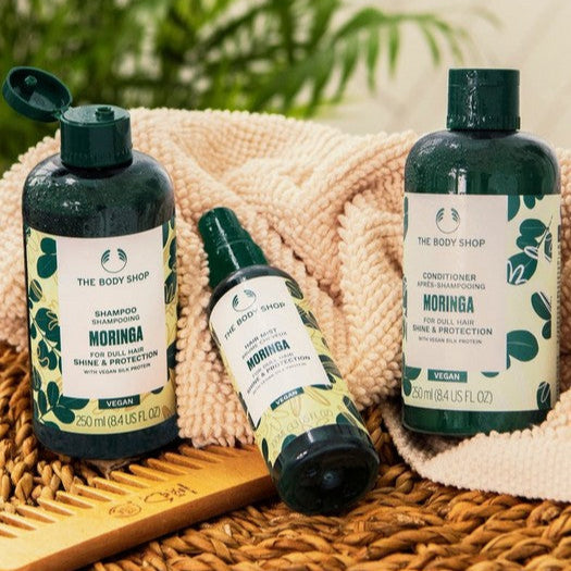 Zertifiziert von der Vegan Society und mit 93 % Inhaltsstoffen natürlichen Ursprungs, darunter Moringa-Samenextrakt aus Ruanda aus fairem Handel, lässt unser Shampoo stumpfes Haar glänzender und strahlender aussehen und schützt es vor täglichen Umwelteinflüssen.* Es macht dein Haar sogar weicher, geschmeidiger, gesünder und luftig leicht.*